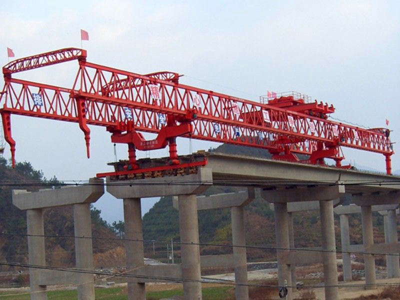 红旗型架桥机和燎原型架桥机属此类,吊重也是130吨。其吊臂是由左右两条箱梁组成,两梁贯通机身并向前后端伸出。在两端都有各由两腿杆组成的折叠立柱。红旗型两梁的中距为3.4米,燎原型的则为4.8米。横跨两条箱梁有两台桁车,能沿吊臂纵向行驶。吊梁小车置于桁车上,能沿桁车横向行驶。待架的梁片(或整梁)可用铁路平板车直接送到架桥机的后臂之下,用吊梁小车起吊后,凭桁车前移,再以吊梁小车横移,然后落梁就位。这类架桥机的前后端都可吊梁及落梁;改变架梁方向时,不需要调头;为适应曲线架梁,前后臂都可在水平面内摆动;分片架设时不必移梁或拨道,梁即可就位;"喂梁"也不需要桥头岔线或特制运梁车。